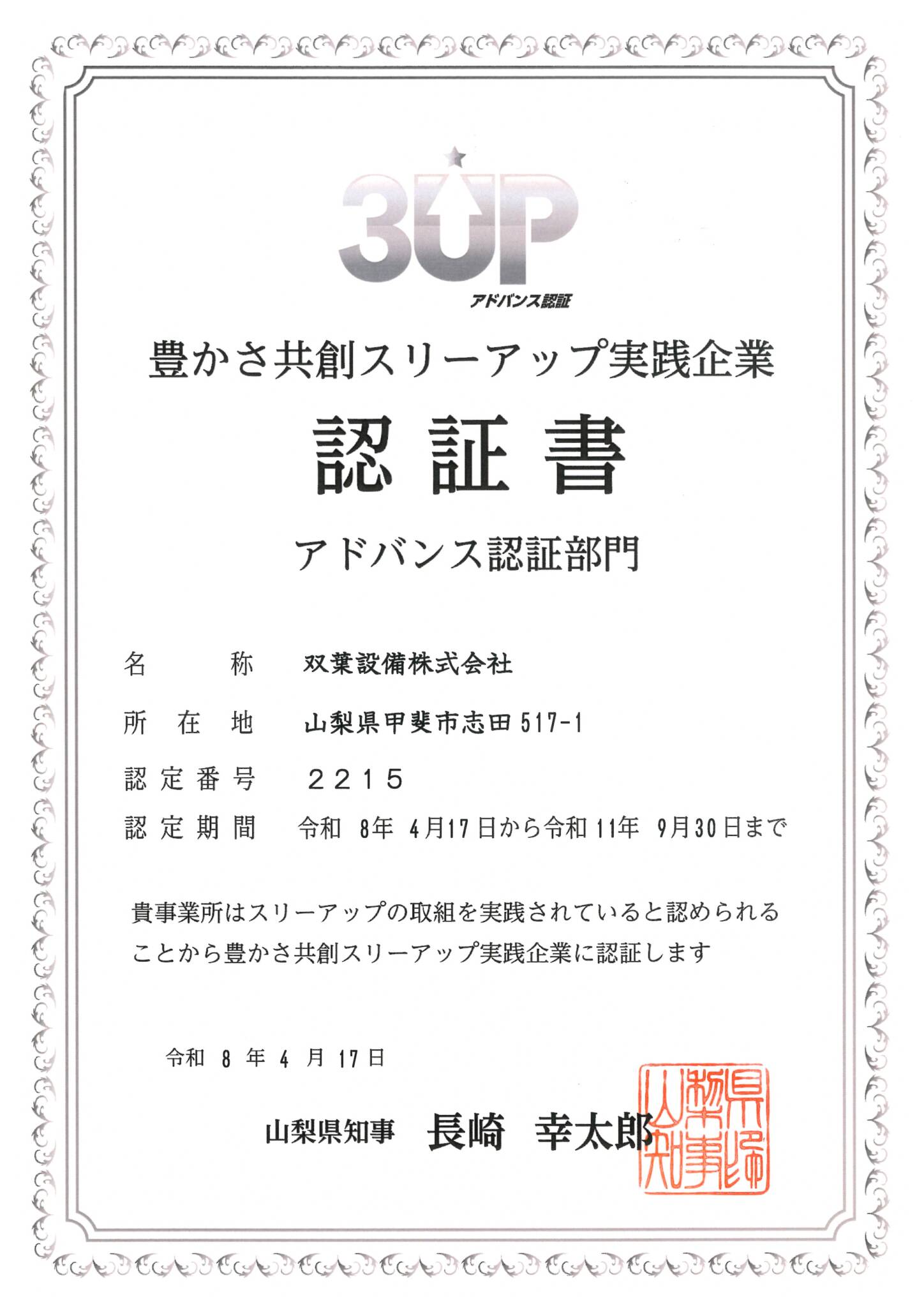 企業の「スキルアップ・収益アップ・賃金アップ」の取組を実践している【豊かさ共創スリーアップ認定企業】として登録され、