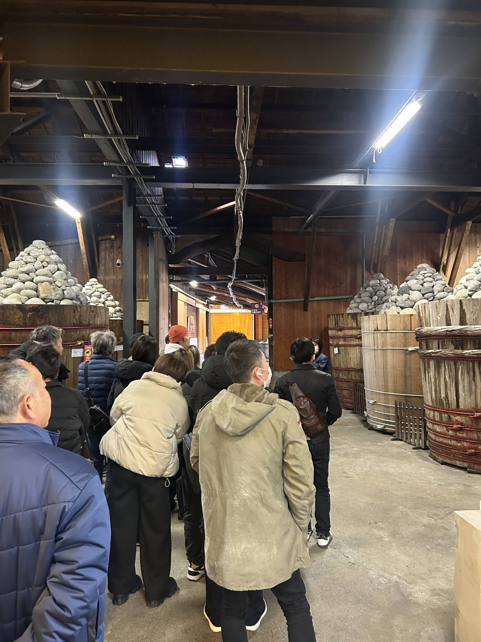直径・高さとも6尺もある木桶のサイズ、さらにその上に円錐状に積上げた重石の積上げ方は伝統の技の様で目を奪われました。