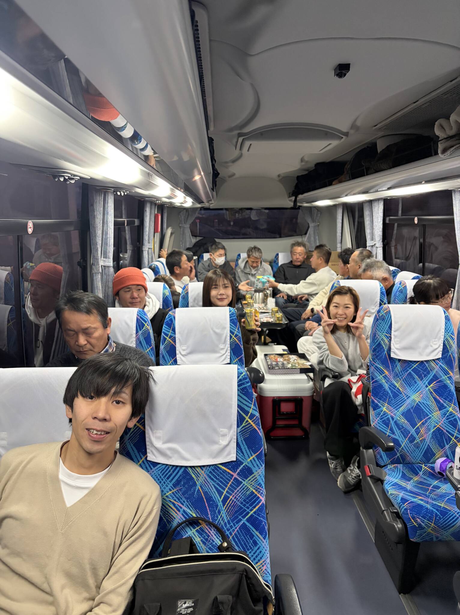 観光バスを貸し切り、朝日を車内で浴びながら目的地へと進んでいきました。